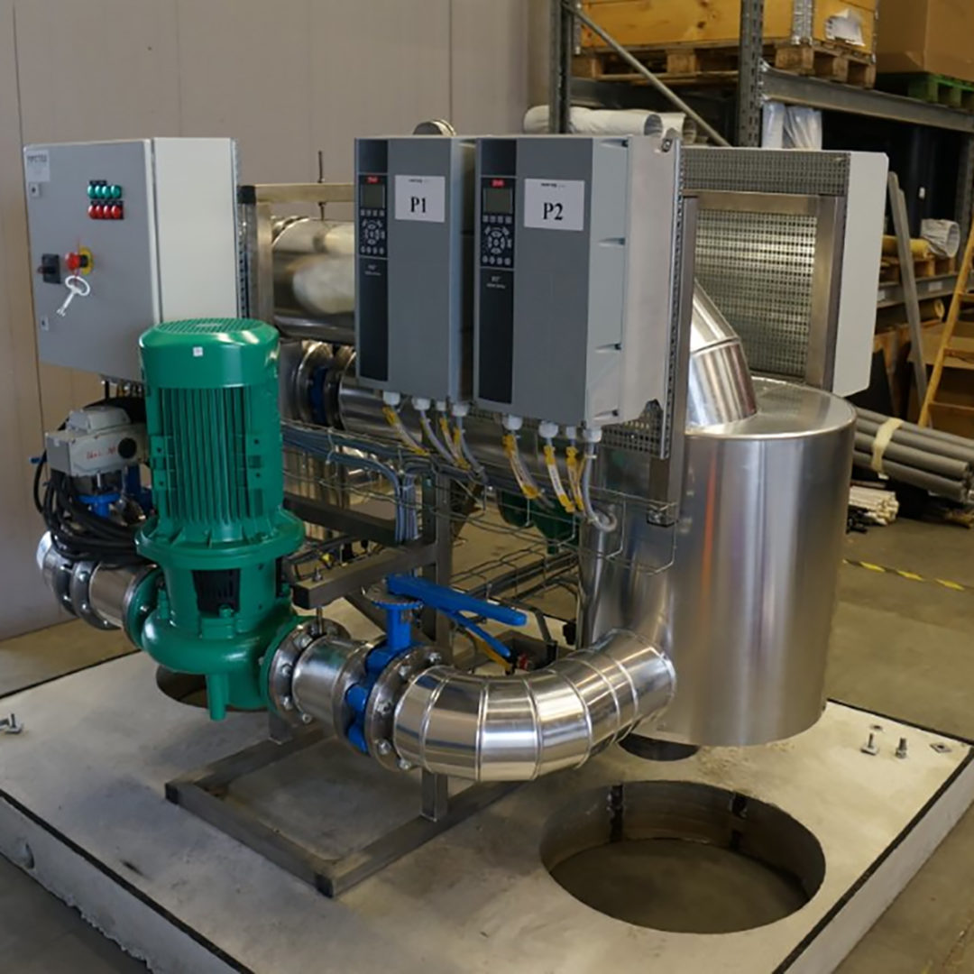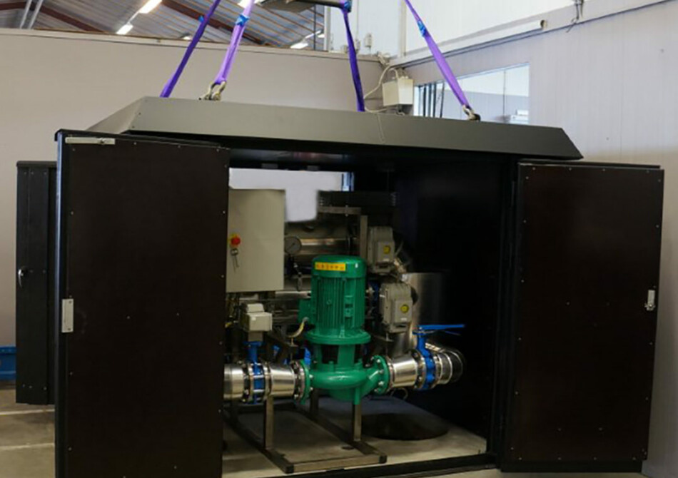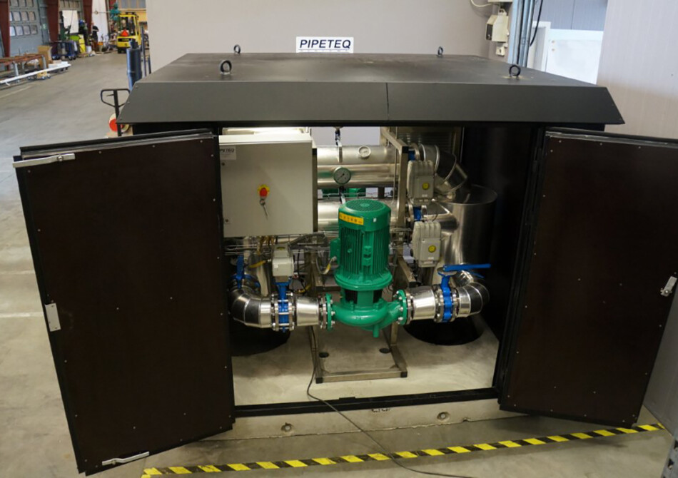 Boosterstationen er leveret gennem Pipeteq A/S, som har udviklet en ny og meget kompakt ”plug and play” booster unit. Pipeteq har valgt Priess A/S, som deres nye hus leverandør på denne nyudviklede unit til fjernvarme kunder. Huset leveres med aftageligt tag og hus i samme løsning samt betonfundament.
