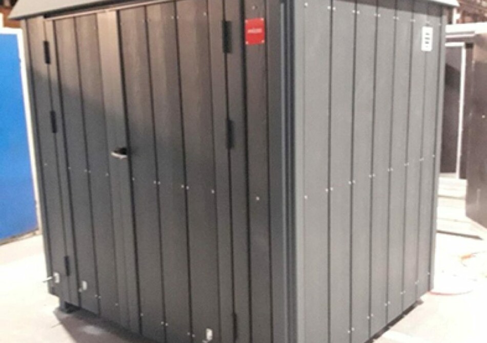 Derefter blev der tilføjet isolering og en udvendig plade i alu-zink. De 2 gavle og langsiderne med dobbeltdørene blev sat sammen, skillevæggen blev sat i og taget blev sat på. Nu var husene klar til at blive malet i vores egen malerkabine.